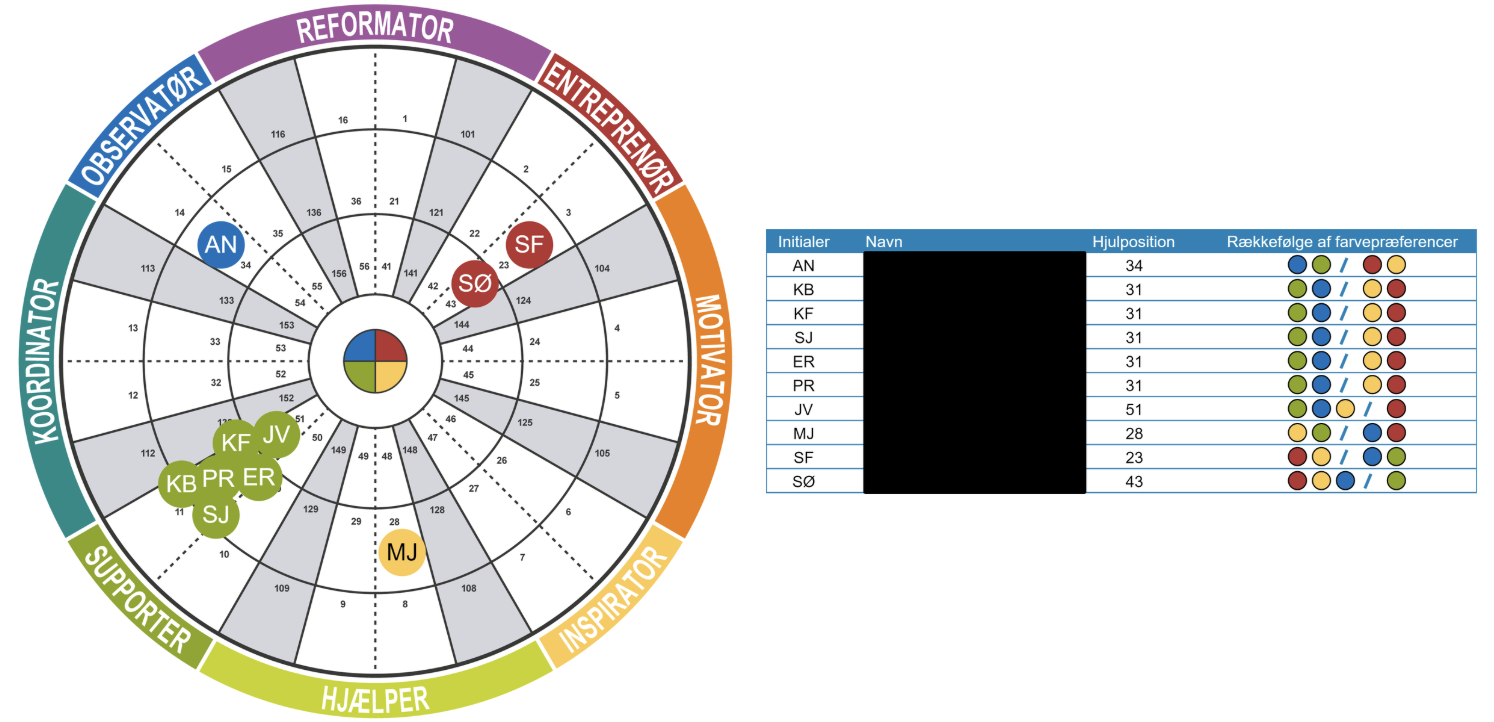 Billedet viser et eksempel på, hvordan medarbejderne i et team fordeler sig på Insights Discovery-hjulet. Med dette overblik vil den rette facilitator kunne pege på teamdynamikker af den gode og mindre gode slags - og facilitere en proces, hvor alle bliver enige om, hvordan de skal arbejde fremadrettet.